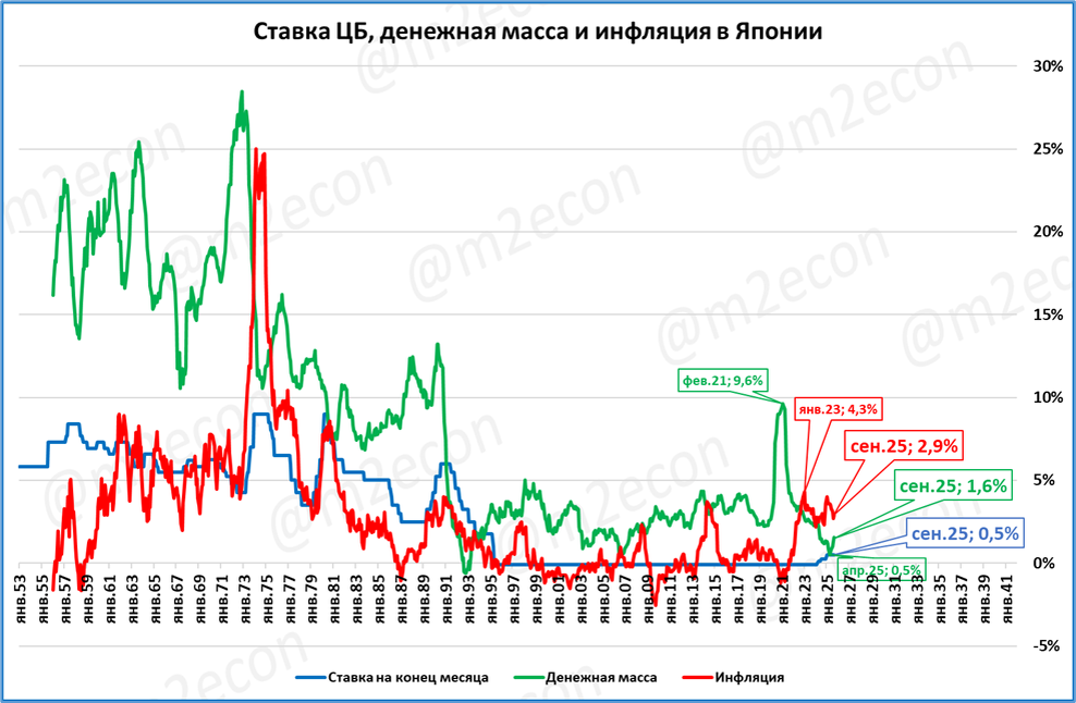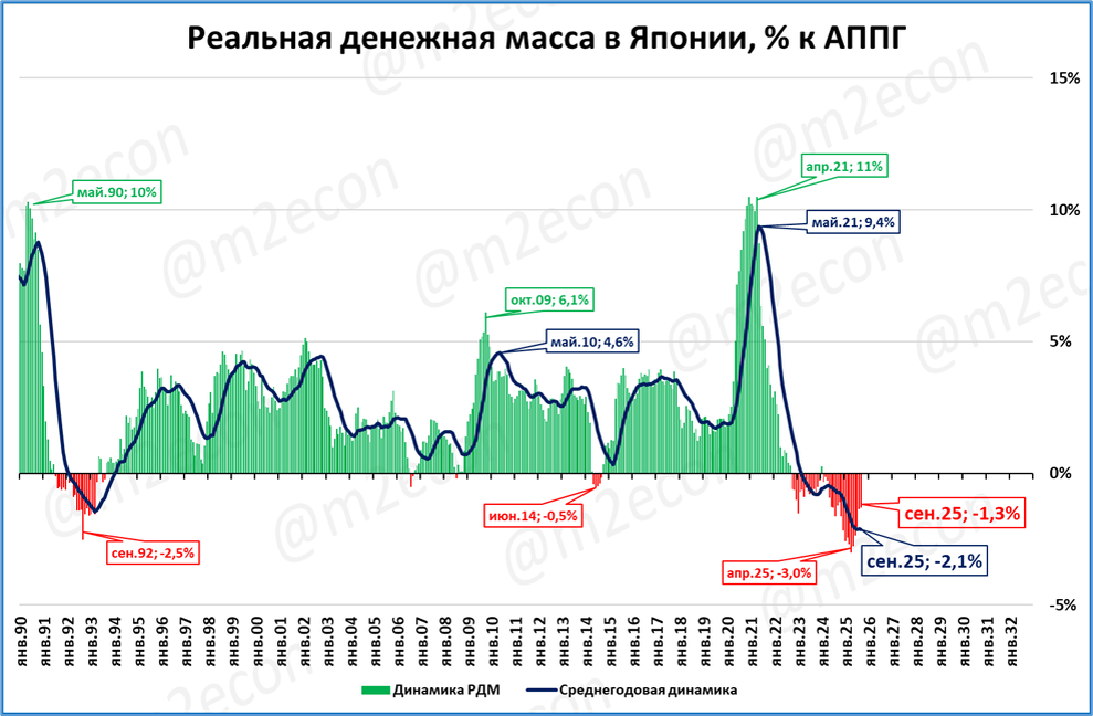 ВВП Японии вырос на 1,7% во 2 квартале, по прогнозу МВФ рост в 2025 году составит 1,1% (в июле прогноз был 0,7%). РДМ продолжает сжиматься в сентябре падение составило 1,3% к сентябрю 2024 года.