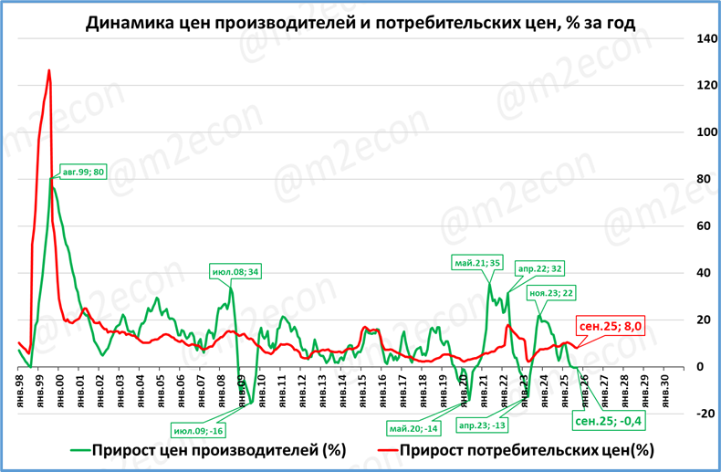 Реальные цены производителей падают, когда в экономике наблюдаются проблемы. Особенно хорошо это видно по кризисам 1998, 2008 и 2015 годов. Нынешние проблемы в экономике индикатор тоже отражает.