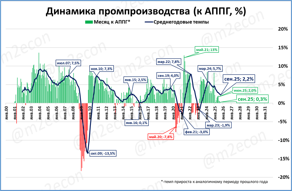 Точнее, это рост в мизерных дозах, сравнимых с погрешностью измерения. Итак, в сентябре промпроизводство на символические 0,3% выше, чем в сентябре 2024 года.