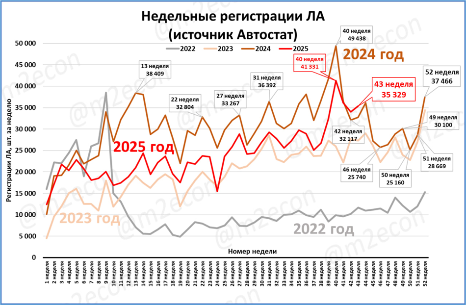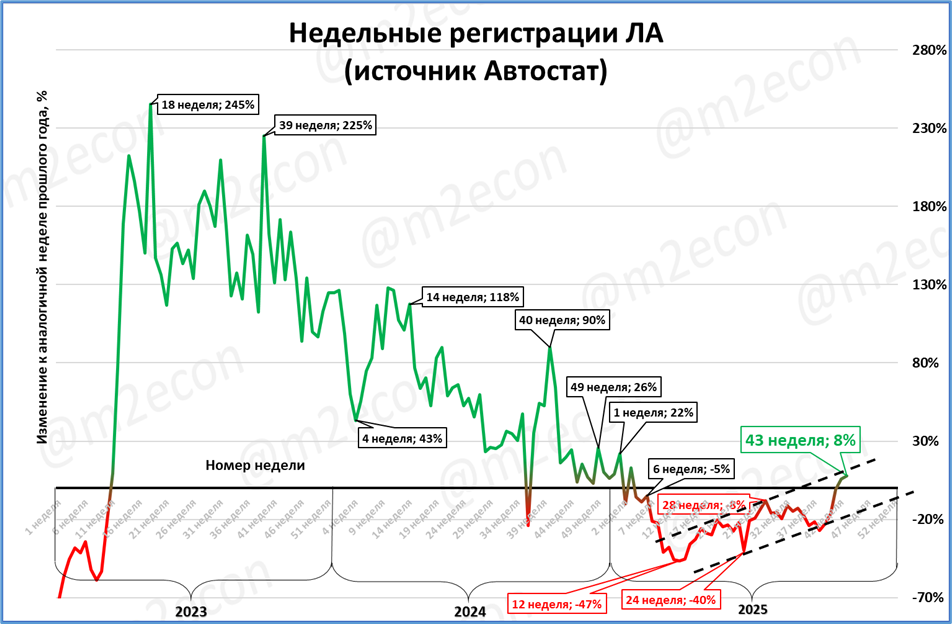 Это лучшая 43 неделя за последние 4 года. Вторую неделю подряд данные выше уровня прошлого года (красная линия выше коричневой).
