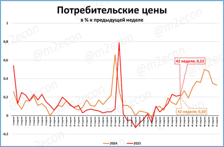 За 42 неделю цены выросли на 0,22%. Это выше, чем за 42 неделю прошлого года (0,20%).
