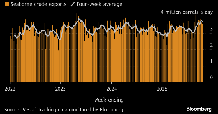 На неделе до 26 октября морской экспорт нефти из РФ снизился с 2,5-летнего максимума, достигнутого в предыдущий отчетный период, пишет Bloomberg со ссылкой на данные по движению судов. Однако агентство объясняет это событие не столько новыми санкциями США, сколько погодой.