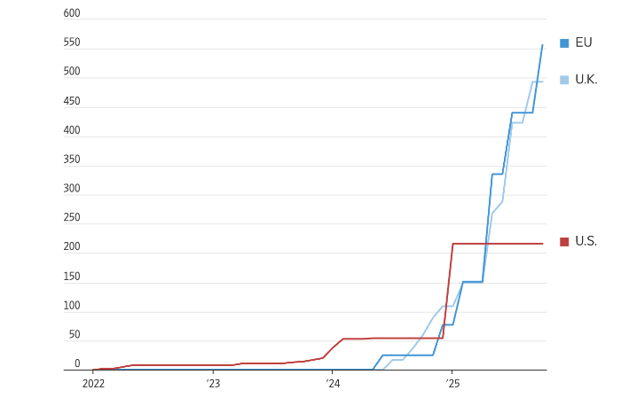 США и Европа действуют не всегда синхронно. По данным Брукса, еС включил в списки более 550 судов «теневого флота», Великобритания — около 500, США — примерно 216. еС и Британия блокируют активы, штрафуют операторов и запрещают заход таких судов в порты.