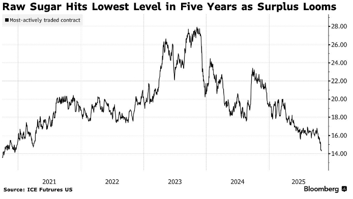 Фьючерсы на сахар-сырец в Нью-Йорке достигли пятилетнего минимума, что усилило вчерашнее внутридневное снижение на фоне растущих ожиданий мирового избытка предложения.