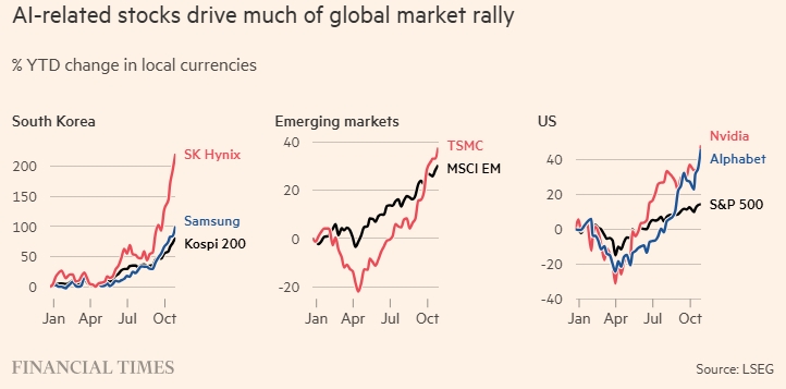 Южная Корея также переживает сильный рост на фондовом рынке: индекс Kospi 200 увеличился на 82 %. Эти результаты впечатляют, но крупнейшие игроки рынка — Samsung Electronics и SK Hynix, обе компании активно работают в сфере ИИ, и на их акции приходится около 30 % корейского фондового рынка.