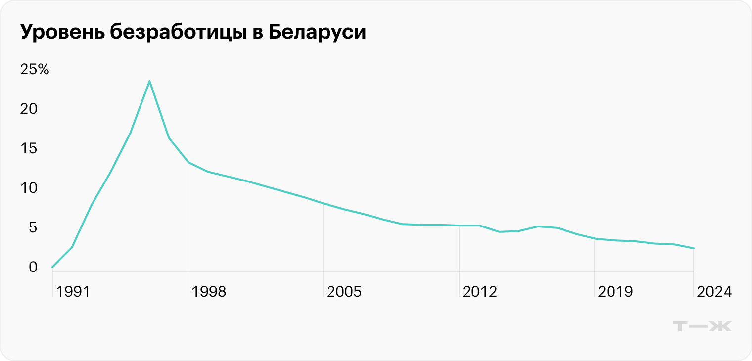 Занятость. В последние годы уровень безработицы в Беларуси низкий. В 2022 году она была на уровне 3,6%, в 2023 равнялась 3,5%, а в 2024 опустилась до 3% — минимальный уровень с 1992 года. Пик безработицы в Беларуси пришелся на 1996 год — тогда она превышала 24%.