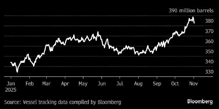 Санкции США против «Роснефти» и «Лукойла» затрудняют продажу российской нефти, пишет Bloomberg со ссылкой на данные по движению судов. По подсчетам агентства, объем российской нефти, скопившейся на танкерах, вырос с сентября на 27 млн баррелей (+8%) до 380+ млн баррелей.