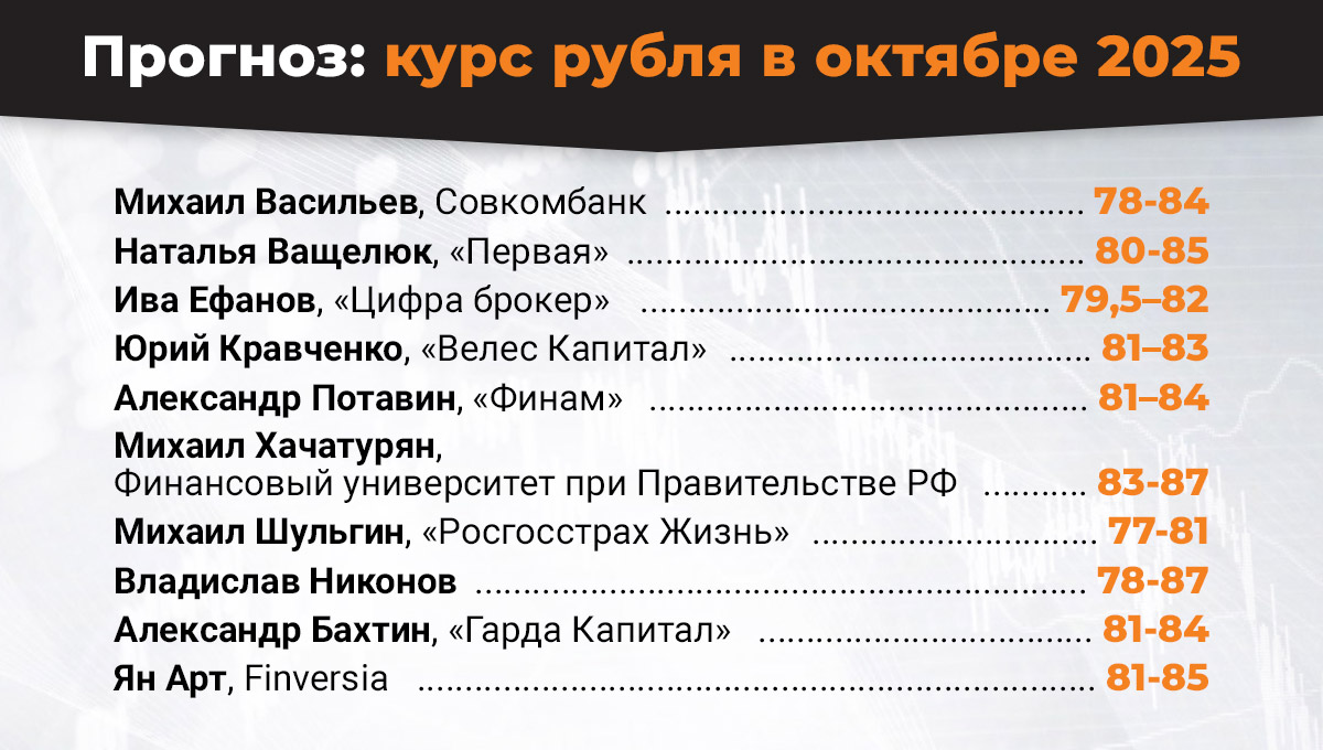 Традиционно портал РБК дал наиболее полный обзор прогнозов по курсу рубля на ноябрь. Главный аналитик Совкомбанка Михаил Васильев ожидает, что если политические условия не изменятся, рубль останется в ноябре крепким – в диапазоне 78-84 за доллар. Старший аналитик управляющей компании «Первая» Наталья Ващелюк ждет в ноябре диапазон 80-85, аналитик компании «Цифра брокер» Иван Ефанов – 79,5-82, начальник отдела анализа банков и денежного рынка компании «Велес Капитал» Юрий Кравченко – 81-83, аналитик компании «Финам» Александр Потавин – 81-84.