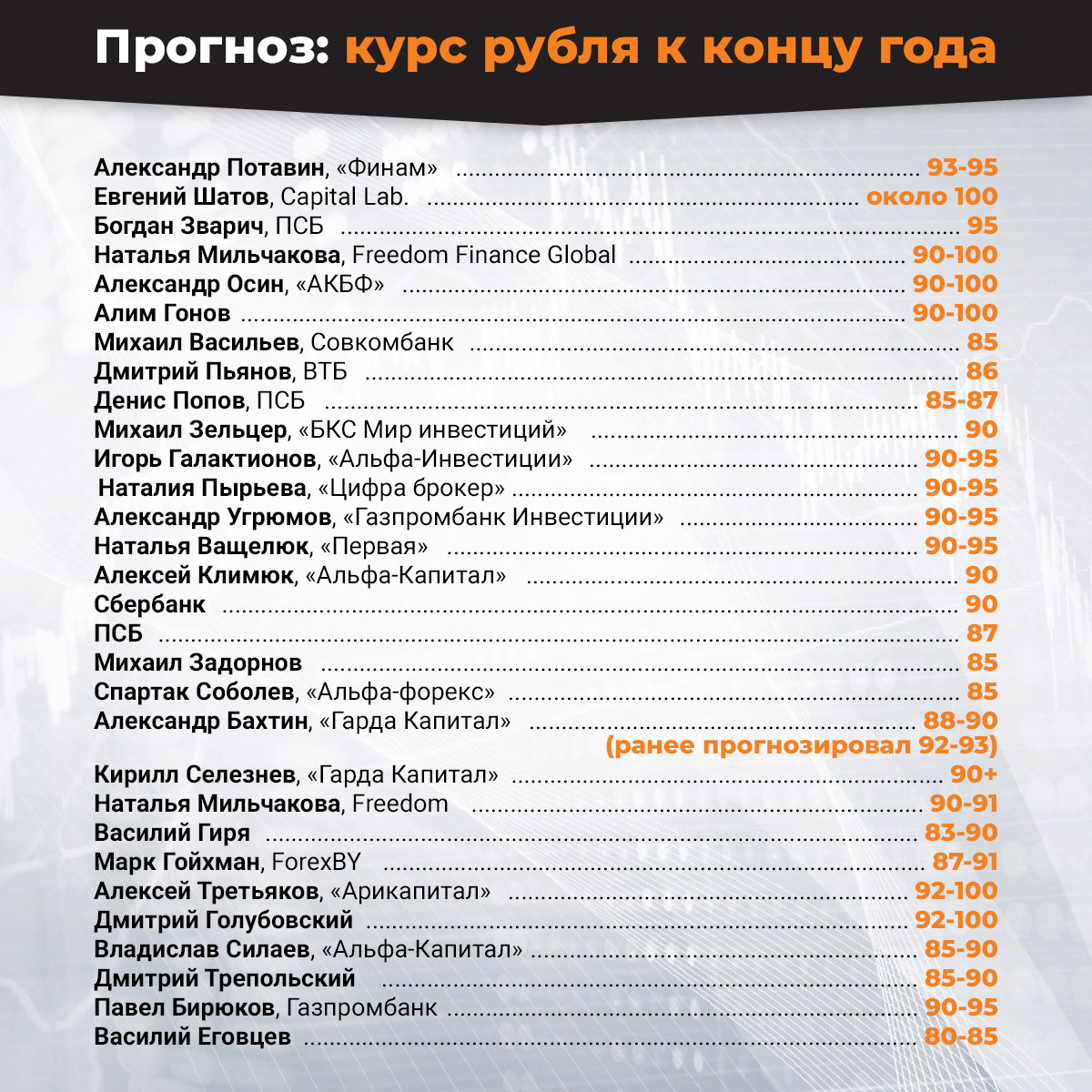 Большинство прогнозов по курсу рубля, звучавших на октябрь, предрекали его снижение в этот самый диапазон -90-100 – и, естественно, оказались абсолютно неверными. Среди них – прогноз финансового эксперта Андрея Голощапова, который ожидал 92-102 за доллар; прогноз доцента РЭУ имени Г.В. Плеханова Эльмиры Асяевой, которая ориентировала на 90-105 за доллар; прогноз руководителя компании SharesPro Дениса Астафьева, ожидавшего 95 за доллар; прогноз основателя инвестиционной платформы Lendet Invest Дмитрия Исакова, который ориентировал на 90-92 за доллар.