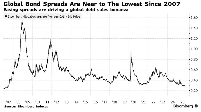 Этот всплеск произошел на фоне того, что уровень глобального кредитного риска остается на самом низком уровне с 2007 года, хотя поток кредитов начинает расширять корпоративные спреды. Тем не менее, спрос на долговые обязательства превышает их предложение, а общая доходность инвесторов за год превысила 7% — это лучший показатель за пять лет.