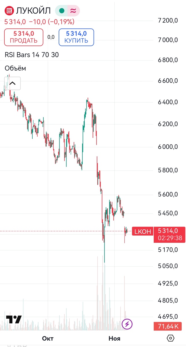 Но как видим, инвесторы всё же голосуют рублём. Акции Лукойла обвалились к уровню 5300. Акции распродаются на больших объёмах. И это логично. Если всё пойдёт по самому негативному сценарию, то текущая цена Лукойла является завышенной.