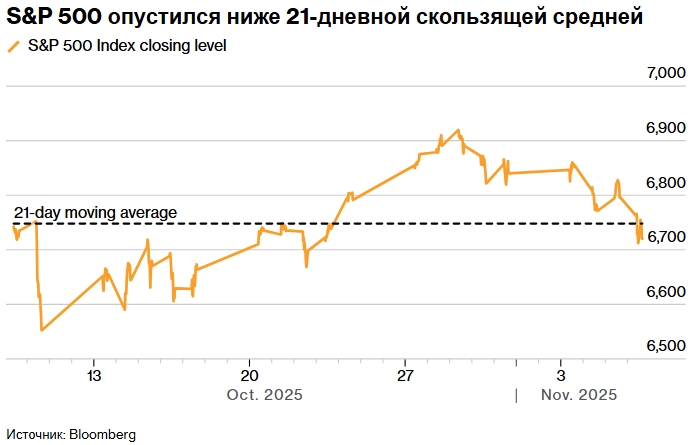 Сомнения в рентабельности инвестиций в искусственный интеллект, сопровождаемые высокими ценами на акции, привели к тому, что в четверг индекс S&P 500 упал до 6720,32 пункта, что стало самым низким показателем за последние две недели. Аналитики отмечают, что 50-дневная скользящая средняя, находящаяся на уровне 6665 пунктов, может стать важным уровнем поддержки.