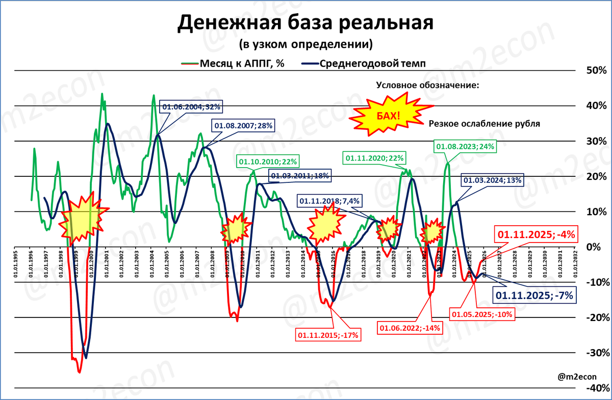Динамика узкой денежной базы с небольшими отличиями повторяет динамику широкой денежной базы.