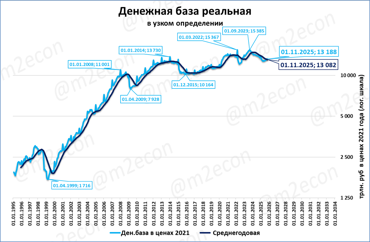 ДБ в узком определении на 1 ноября установила исторический рекорд (19 трлн рублей). В реальном же выражении, с учётом инфляции, она продолжает сжиматься: -4% к 1 ноября прошлого года.