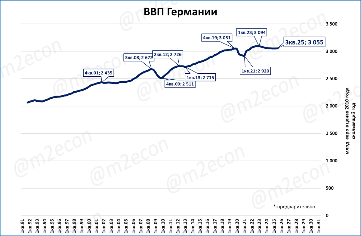 ВВП Германии в 3 квартале вырос на 0,3%. В первом и втором квартале наблюдался нулевой рост. Экономика Германии стагнирует, сейчас она на том же уровне, что и шесть лет назад, в 2019 году.