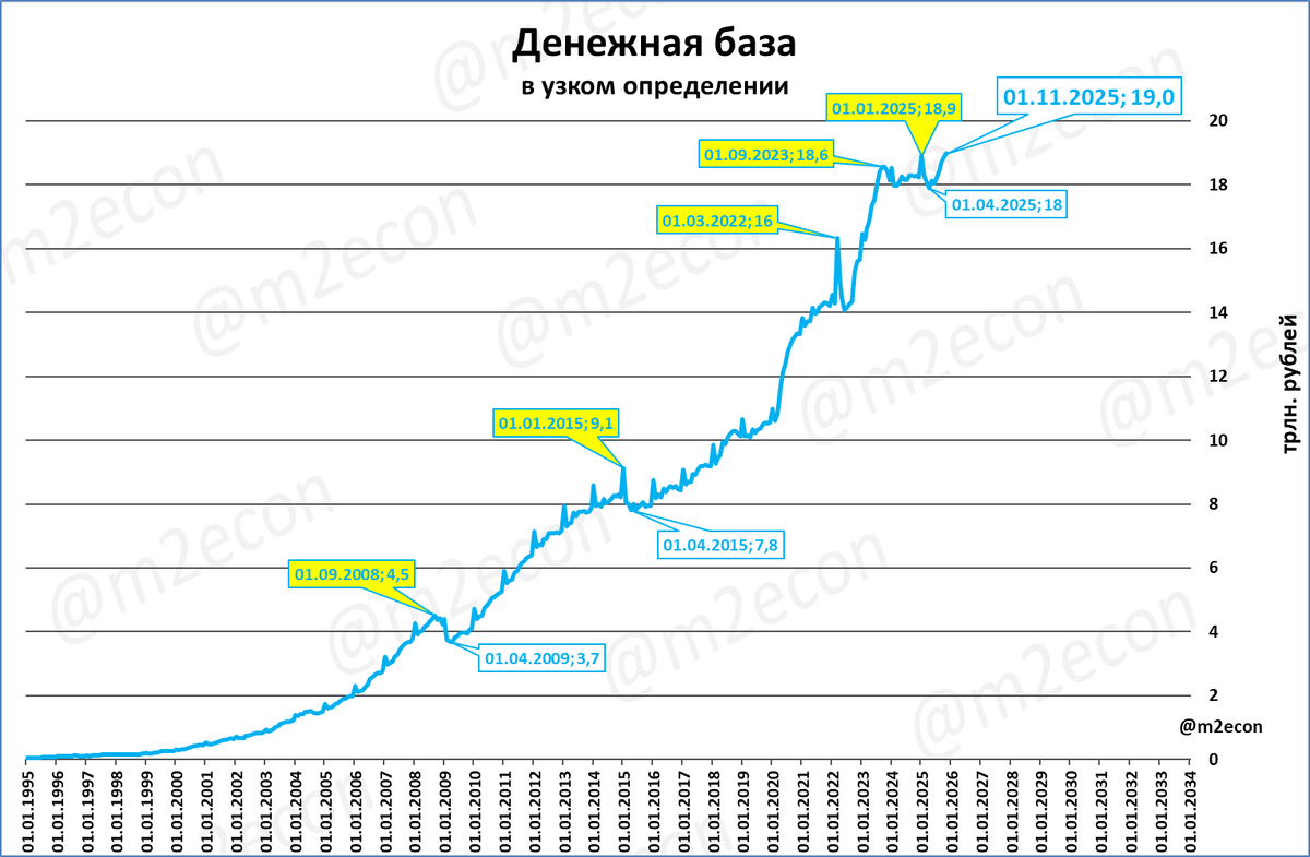 Узкая денежная база (УДБ; в основном это наличные вне Банка России) на 1 ноября установила очередной исторический рекорд, достигнув 19 трлн рублей.