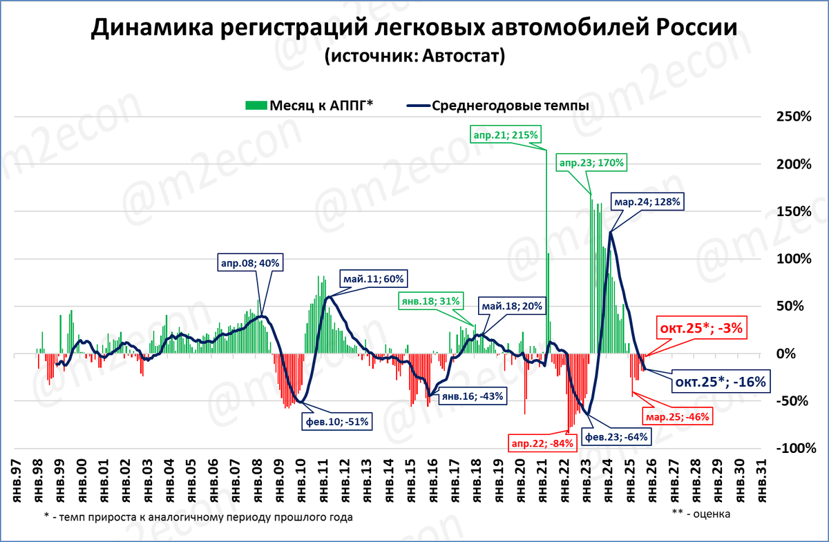 Октябрь на рынке легковых автомобилей стал вторым лучшим месяцем за последние 3 года. Падение в годовом выражении замедлилось до -3%.