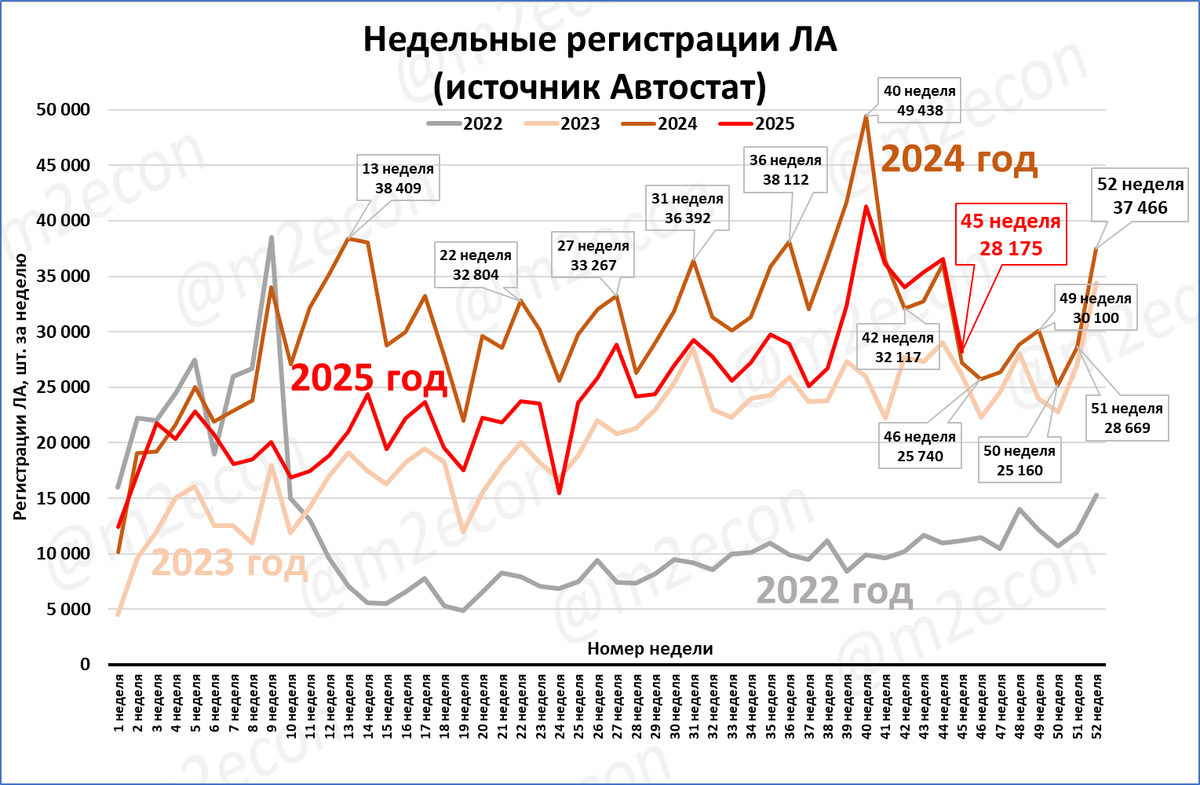 По данным агентства «Автостат», регистрации легковых автомобилей на 45 неделе составили 28,2 тыс. шт.