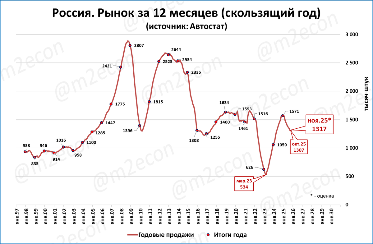 С 1,307 млн по итогам октября 12-месячные продажи могут вырасти до 1,317 тыс. по итогам ноября.