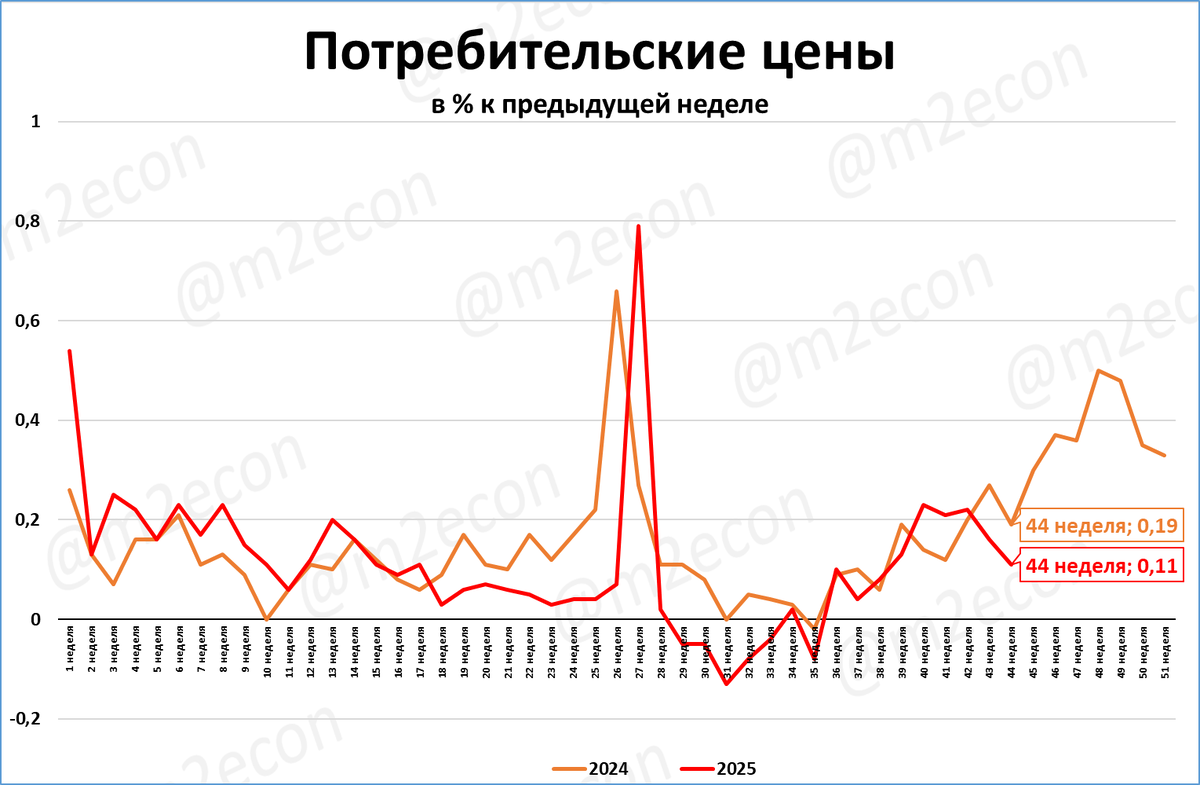 О снижении годовой инфляции говорят и недельные данные. За 44 неделю* цены выросли на 0,11%. Это ниже, чем за 44 неделю прошлого года (0,19%).
