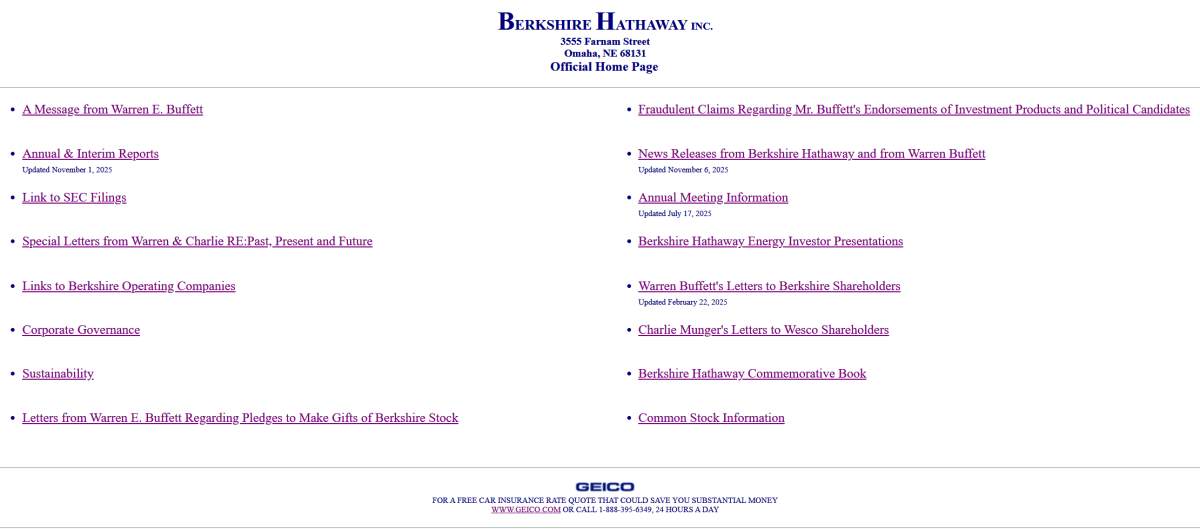 В общем-то, об «аналоговости» Баффетта ярко говорит даже сайт Berkshire Hathaway: да, вот так выглядит главная страница ведущего финансового холдинга мира в 2025 году.