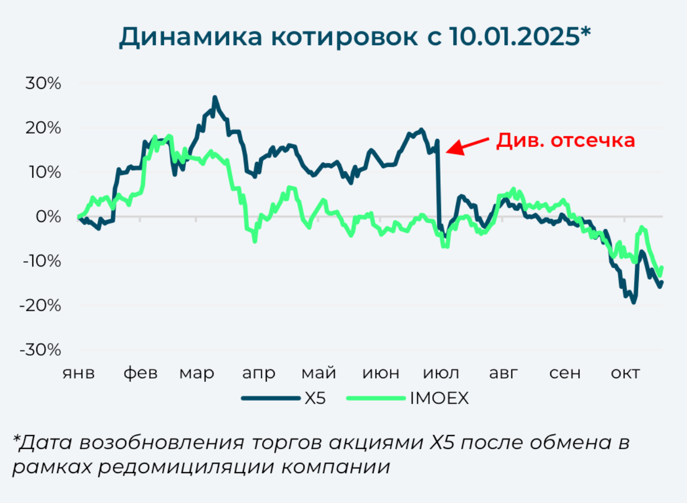 С начала октября к текущему моменту акции Х5 потеряли 11%, в то время как индекс Мосбиржи - 6%. Устранение перепроданности и дивиденды по итогам 9М25 с ожидаемой доходностью 11% могут в совокупности привести к росту акций на 16% на горизонте 2 месяцев. Мы считаем, что акции опередят индекс Мосбиржи, который ждем на уровне 2 750 – 2 800 п. к концу года (+11% от текущего значения).