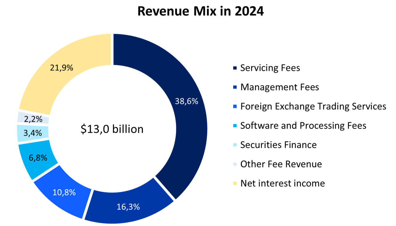 Комиссионные доходы, генерируемые сегментами Investment Servicing и Investment Management, составляют большую часть выручки компании. В 2024 году доходы от комиссий обеспечили 78,1% общей выручки. Эти доходы включают комиссионные за обслуживание, управленческие комиссии, комиссии за услуги при торговле иностранной валютой, комиссии за финансирование ценных бумаг, за ПО и обработку данных, а также другие сборы.