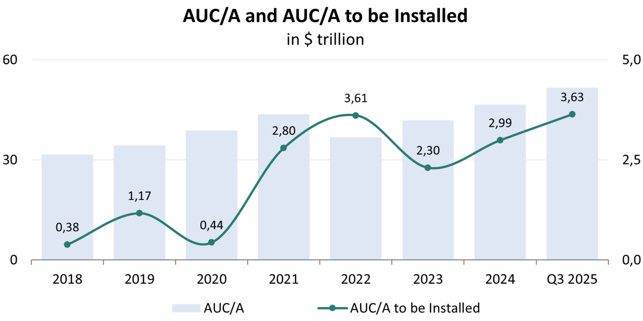 - Объем активов под кастодиальным управлением и/или администрированием (AUC/A) компании достиг $51,7 трлн по состоянию на сентябрь 2025 года (+11,0% к декабрю 2024), а AUM — $5,4 трлн (+15,5% к декабрю 2024) за счет положительных тенденций на фондовом рынке, чистого притока инвестиций и стратегических инициатив.