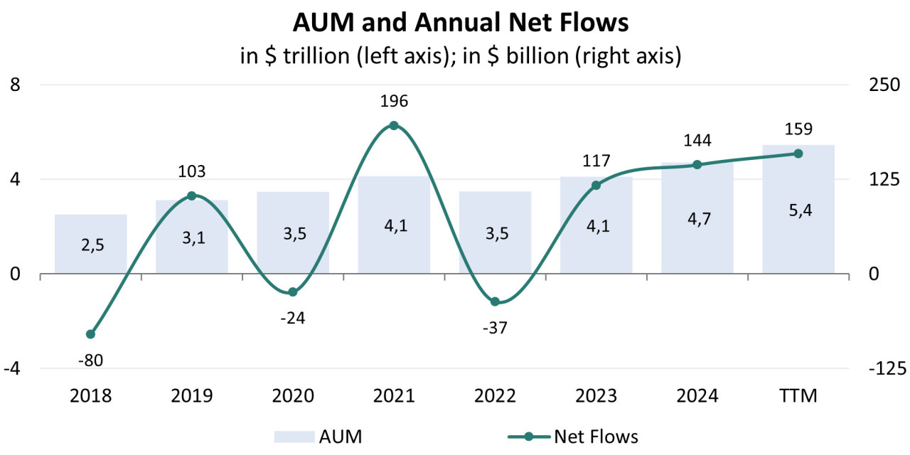 В 2024 году отрасль управления активами показала сильные результаты. Объем активов под управлением (AUM) достиг $135 трлн, увеличившись на $15 трлн — это стало крупнейшим годовым приростом за последнее десятилетие. Около 70% роста обеспечили фондовые рынки благодаря росту ключевых индексов, а оставшиеся 30% пришлись на чистый приток средств, что свидетельствует о восстановлении спроса со стороны клиентов.