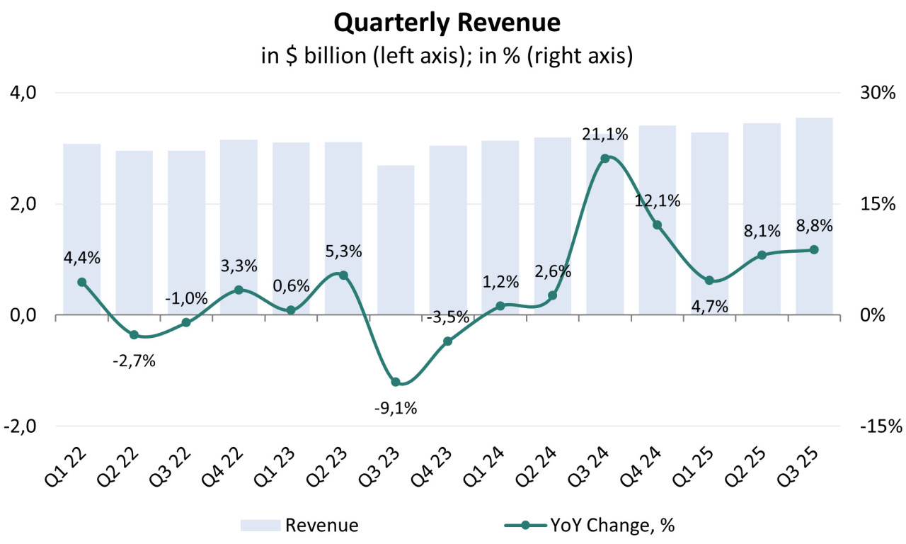 - В 3-м квартале 2025 года общая выручка State Street выросла на 8,8% г/г благодаря росту комиссионных доходов на 8,1%. Чистый процентный доход снизился на 1,1% г/г, однако рентабельность улучшилась: маржа до налогообложения выросла с 28,4% до 31,1%, а рентабельность материального собственного капитала (ROTCE) улучшилась с 19,3% до 20,9%.