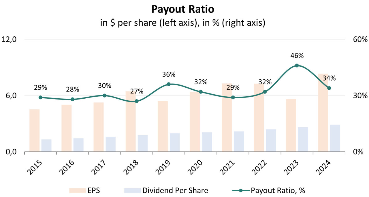 Благодаря сильным операционным результатам и улучшению рентабельности, State Street продолжает возвращать капитал акционерам. Компания выплачивает ежегодные дивиденды как минимум с 2015 года, стабильно увеличивая выплаты каждый год. Дивиденды выросли с $1,32 на акцию в 2015 году до $2,90 в 2024 году, что соответствует CAGR 9,1%. Относительно средней цены акций за каждый год, средняя годовая дивидендная доходность (DY) за период 2015–2024 годов составила 2,7%. Кроме того, State Street поддерживает стабильный коэффициент выплат, в среднем 32% за тот же период, что отражает дисциплинированный и последовательный подход к возврату стоимости акционерам.