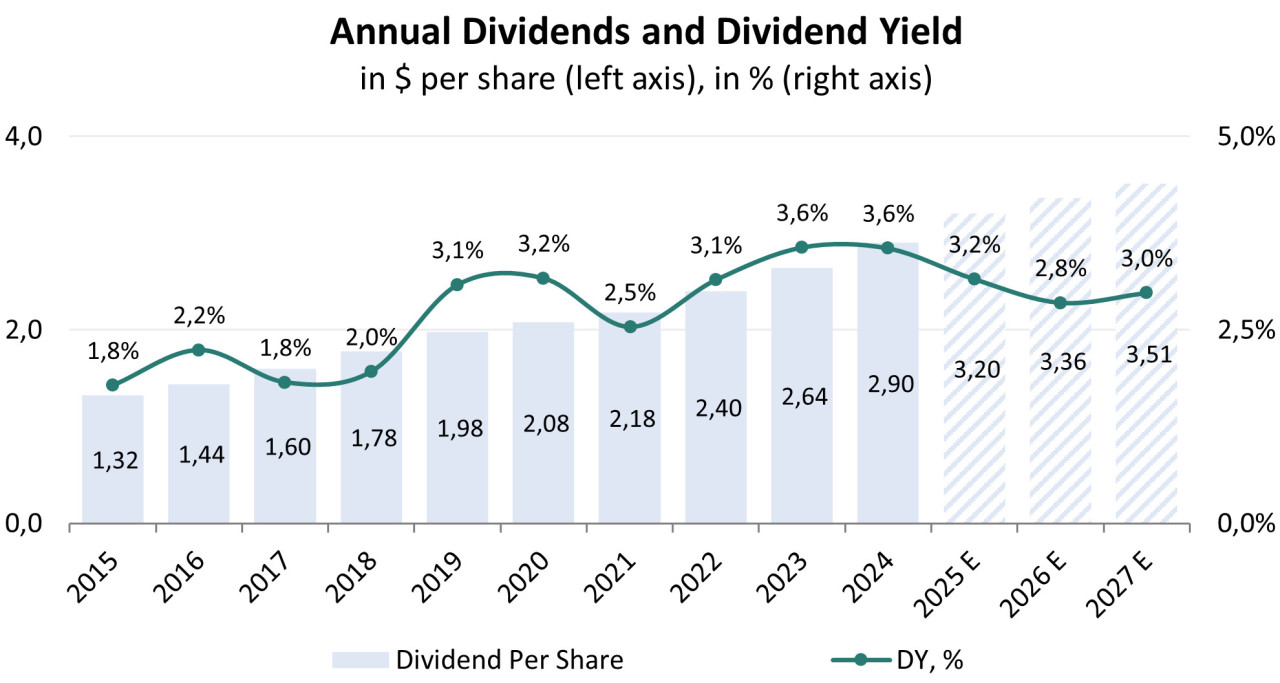 Прогнозная дивидендная доходность в 2026 и 2027 годах, как ожидается, слегка снизится из-за роста цены акций компании в 2025 году. Тем не менее, инвесторы всё ещё могут рассчитывать на дивидендную доходность приблизительно 3,0% в 2026–2027 годах при следующих предпосылках: