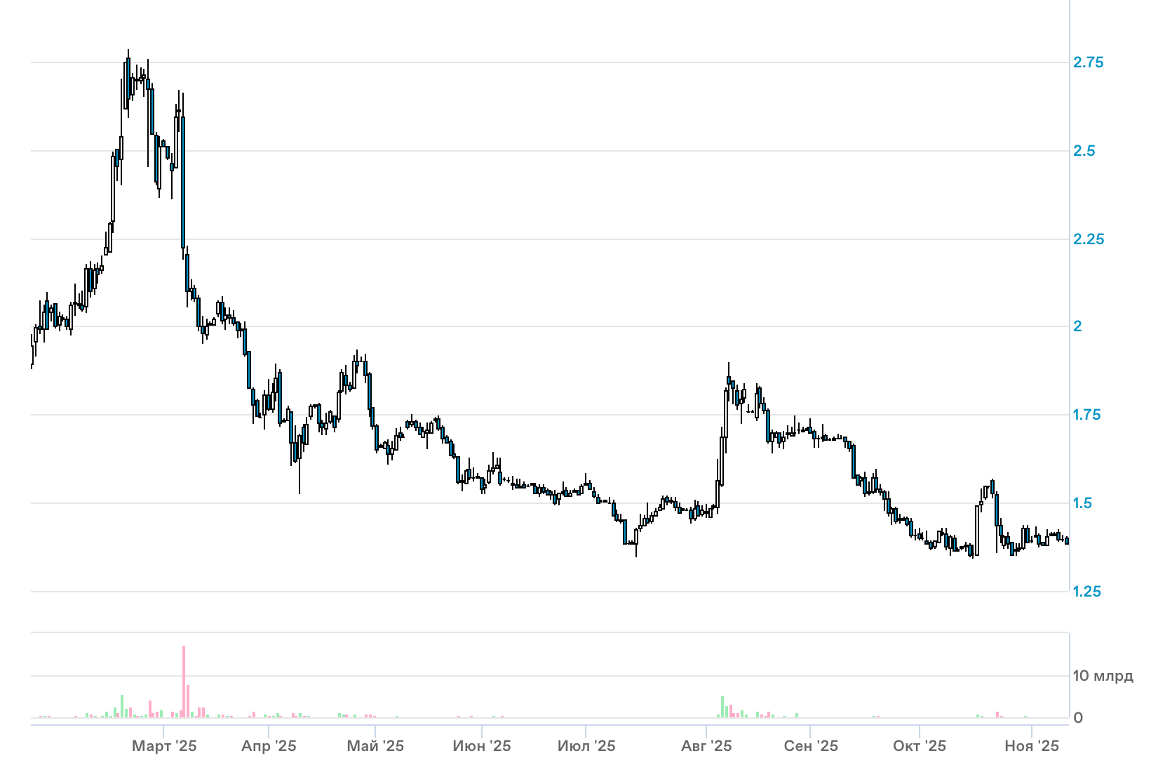 Акции ПАО «Юнипро» с начала ноября практически не изменились в цене, тогда как индекс Мосбиржи вырос на 1%. С начала года бумаги компании снизились на 23% и выглядят хуже рынка.
