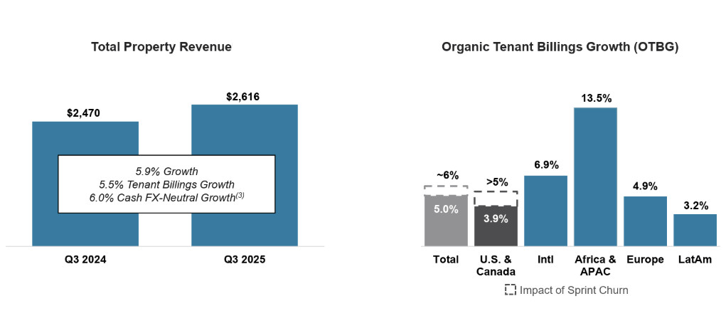 После 3-го квартала 2025 года American Tower повысила средние ориентиры (Midpoints) по всем ключевым показателям: Property Revenue, EBITDA и AFFO (Adjusted Funds From Operations, или скорректированный денежный поток на акцию). Выручка выросла на 7,7% г/г, органический рост выручки от арендаторов (Tenant Billings) составил около 5%, а рост денежного потока на валютно-нейтральной основе — около 6%. Это подтверждает ускорение как в США, так и на зарубежных рынках. Отдельно стоит отметить вклад так называемых Pass-Through (индексации и возмещаемых расходов) и эффект валют (FX), которые поддерживают общую динамику, но не заменяют базовый органический рост.