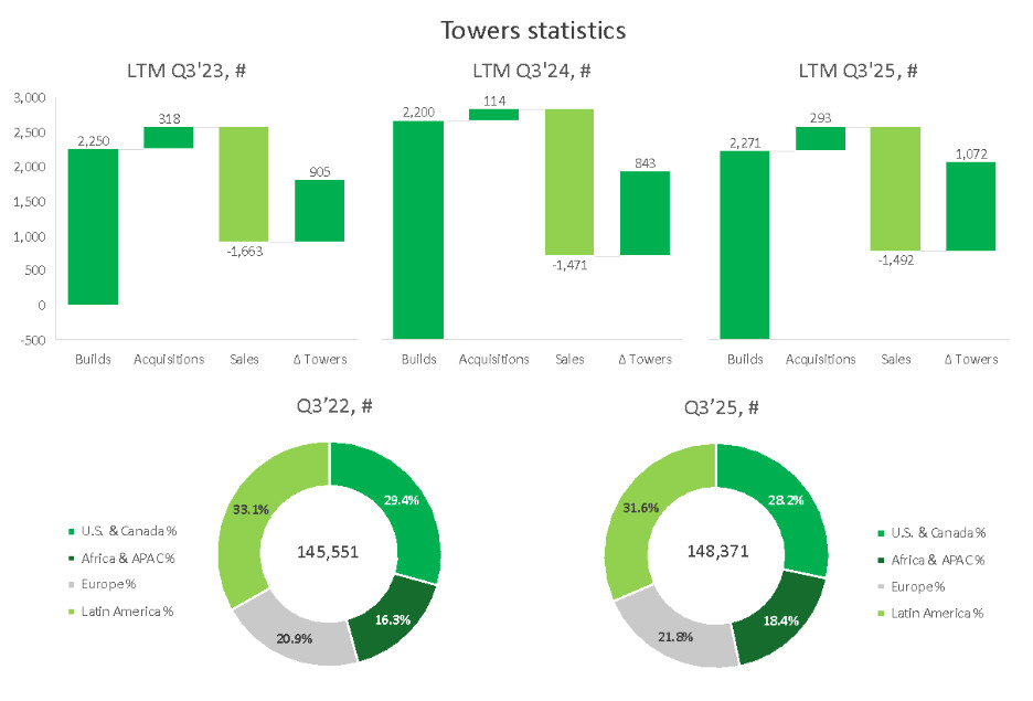 American Tower продолжает расширять базу объектов. За последние 12 месяцев к концу 3-го квартала 2025 года добавлено более 1 тыс. башен: новые проекты и точечные сделки полностью компенсировали продажи непрофильных активов. Доля США в общем портфеле немного снизилась, зато быстрее растут регионы Африки, APAC и Европы. Это усиливает географическую диверсификацию и поддерживает валютно-нейтральный рост. На горизонте ближайшего времени это, конечно, создаёт дополнительный потенциал для органического роста вышеупомянутых Tenant Billings за счёт новых арендаторов, установки антенн и расширения существующих площадей.