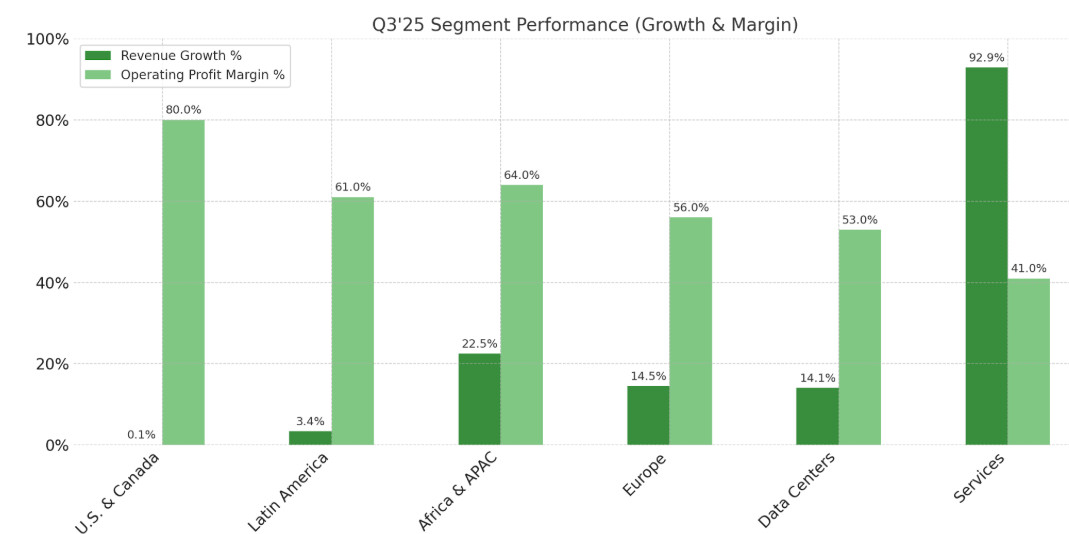 На диаграмме выше видно, что дата-центры демонстрируют двузначный рост при операционной марже около 50%. Это создаёт другой профиль доходности по сравнению с башенным бизнесом в США, где темпы роста выручки в 2025 году умеренные, но маржа остаётся на максимальном уровне. То есть компания получает сочетание устойчивых арендных доходов и ускоренного роста за счёт CoreSite.
