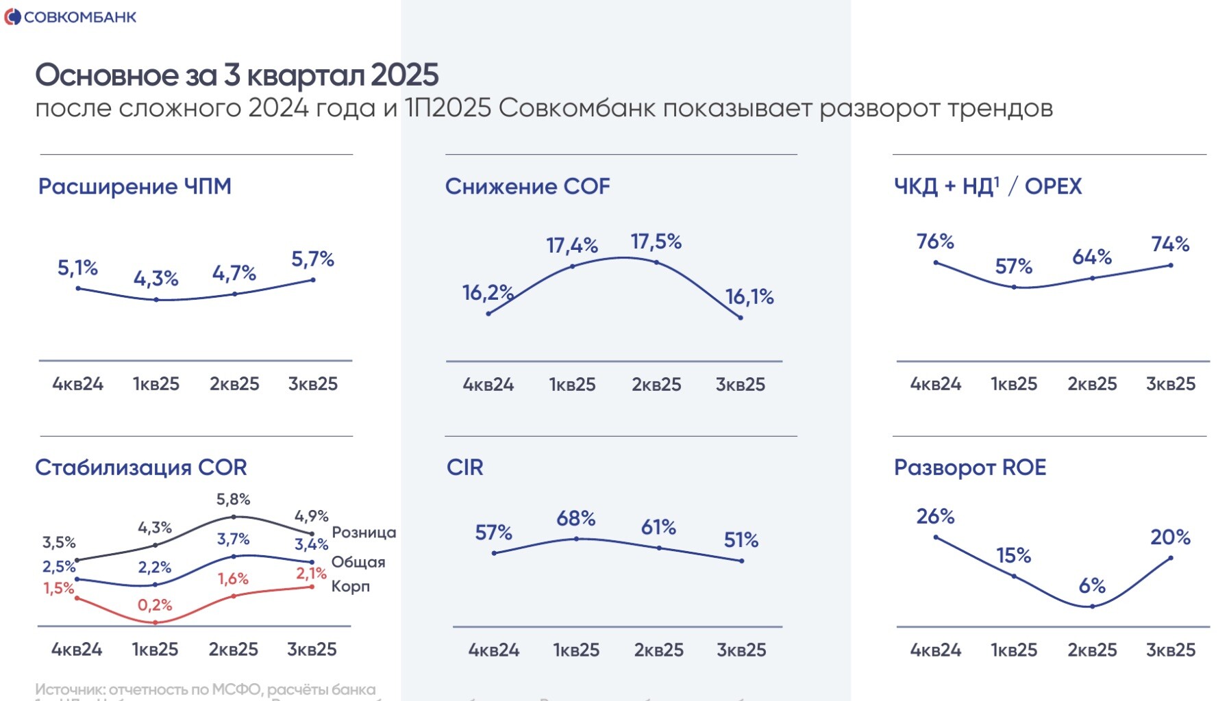1️⃣ 9М 2025 и третий квартал За 9М 2025 года Совкомбанк заработал 35,4 млрд руб. чистой прибыли против 56,5 млрд руб год назад. Почти половина этой суммы (17,8 млрд руб.) пришлась на третий квартал. Средняя рентабельность капитала около 13% против ~26% годом ранее, при этом в самом третьем квартале она уже была близка к 20%.