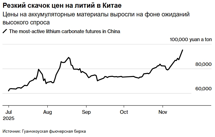 Цены на литий в Китае растут уже третий день подряд на фоне оптимистичных прогнозов. Самый активный контракт на карбонат лития превысил 100 000 юаней (14 065 долларов) за тонну, но затем немного снизился. Спотовые цены на материал достигли максимума с июля 2024 года. С начала месяца фьючерсы выросли почти на 20%, благодаря растущей уверенности в перспективах спроса.