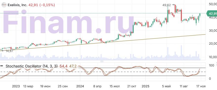 Американская биотехнологическая компания Exelixis за последний год находится в уверенном восходящем тренде на фоне позитивных новостей по части пайплайна. Специализация компании связана с разработкой терапии разновидностей рака, которые пока трудно поддаются лечению, и исследования идут весьма успешно — в конце года ожидается подача в FDA новой заявки, а в 2026 году предстоят дальнейшие одобрения и потенциальная коммерциализация нового препарата. Сегмент онкоиммунологии, в котором ведет деятельность Exelixis, за последние годы вышел на передовую биотеха и приносит все новые научные прорывы.