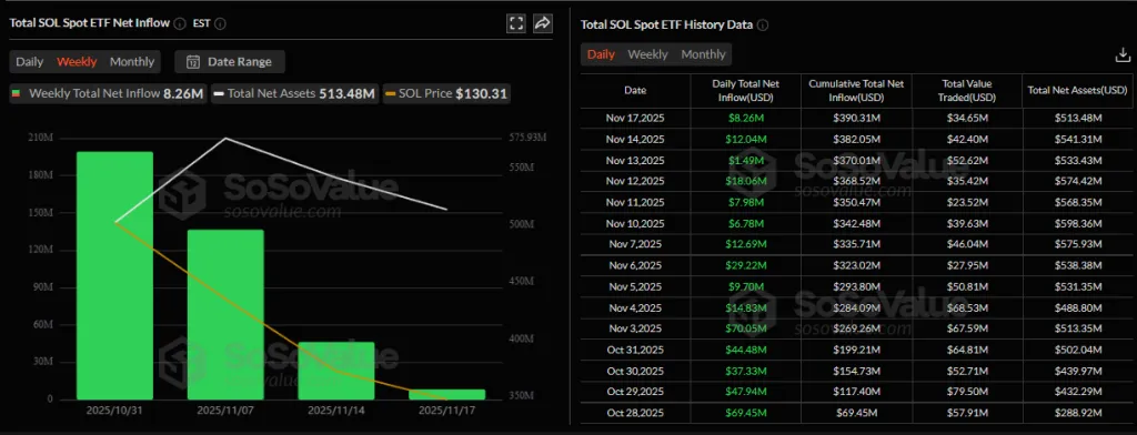 Совокупные чистые поступления в инструменты достигли $390 млн (данные без учета двух новых продуктов). Общий объем активов под управлением составляет $513,48 млн — 0,71% от капитализации Solana.