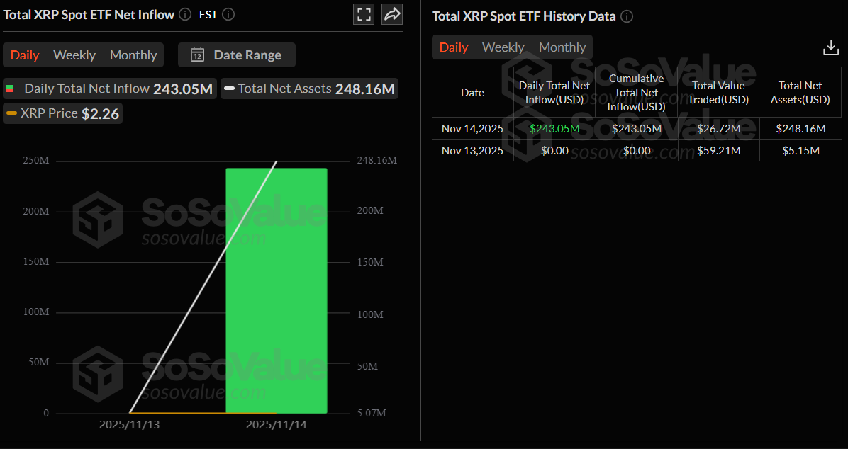 Однако ETF на базе Solana и XRP не фиксировали оттока средств за все время своего существования. 14 ноября приток в SOL-инструменты составил $12,04 млн, а в XRP-фонды — $243,05 млн.