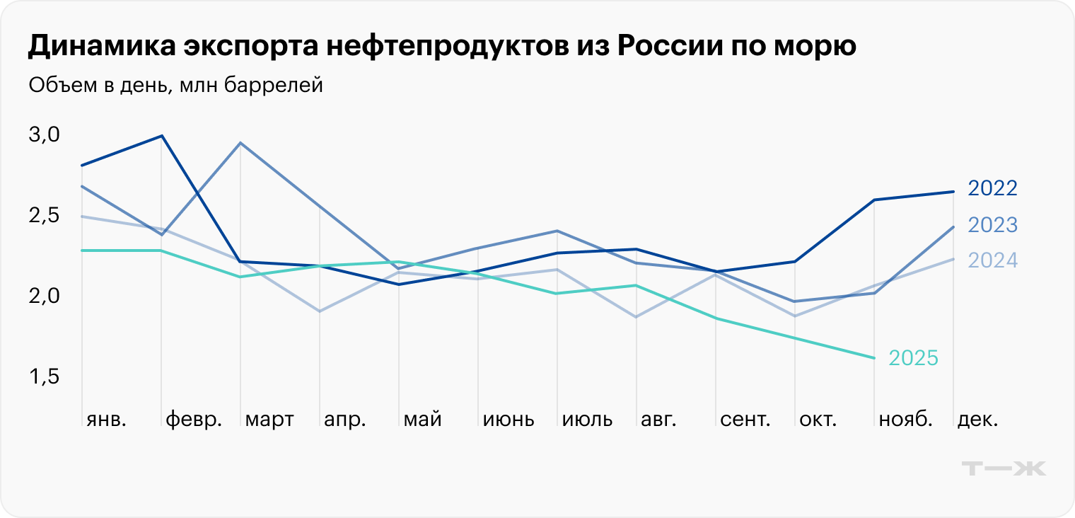 По данным Vortexa, которые приводит Bloomberg, общие морские поставки нефтепродуктов за первые 15 дней ноября упали до минимума с февраля 2022 года — до 1,7 млн баррелей в сутки. При этом издание отмечает, что падение экспорта нефтепродуктов связано не столько с санкциями, сколько со снижением переработки на российских НПЗ из-за атак беспилотников.
