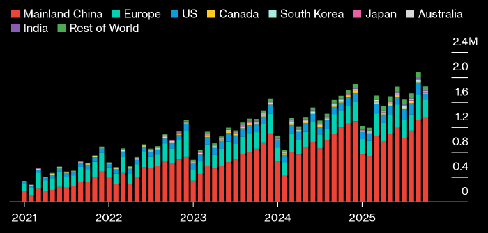 В октябре мировые продажи электромобилей достигли 1,85 млн штук, прибавив 6% к аналогичному показателю прошлого года, подсчитал BloombergNEF. Интересно, что это произошло вопреки обвалу продаж в США на 50% с лишним из-за окончания соответствующих налоговых льгот.