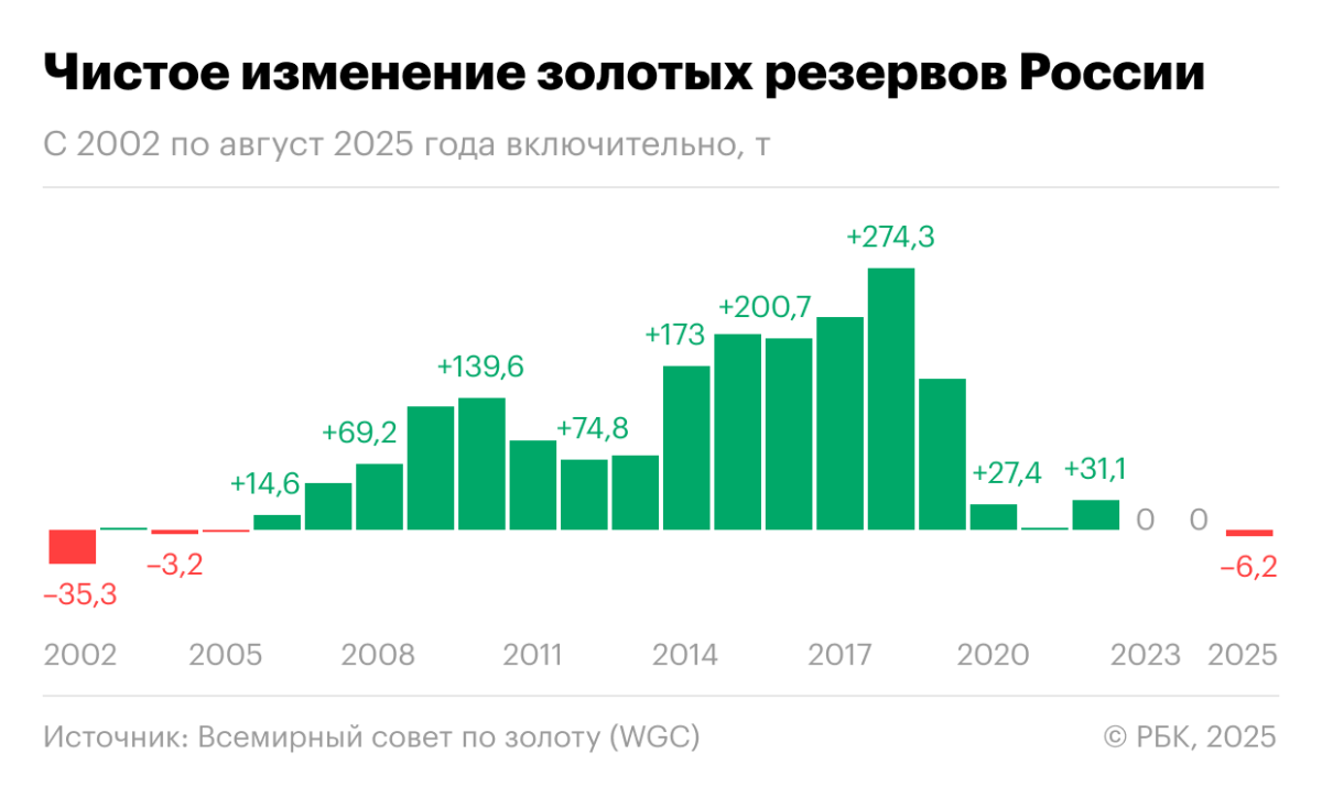 Чистое изменение золотых резервов России, 2002 год — август 2025 года