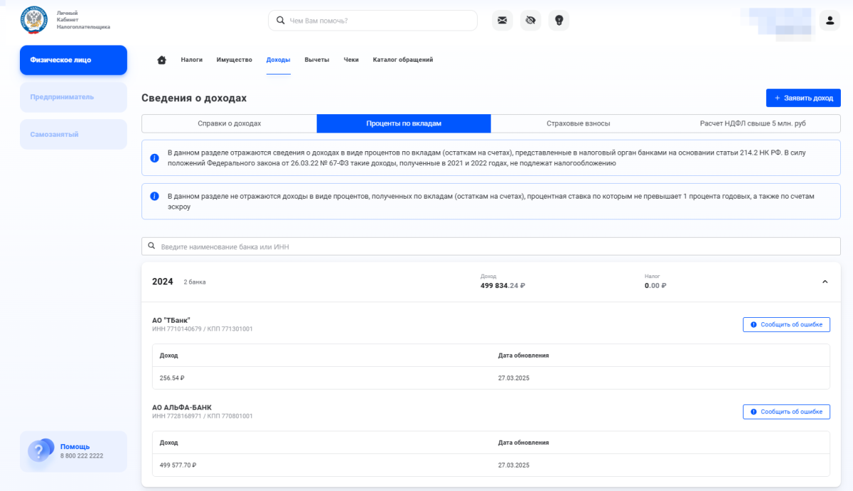 Личный кабинет налогоплательщика содержит информацию о выплаченных процентах от банков в разрезе нескольких лет. Эти сведения можно найти в разделе «Доходы» — «Сведения о доходах» — «Проценты по вкладам».