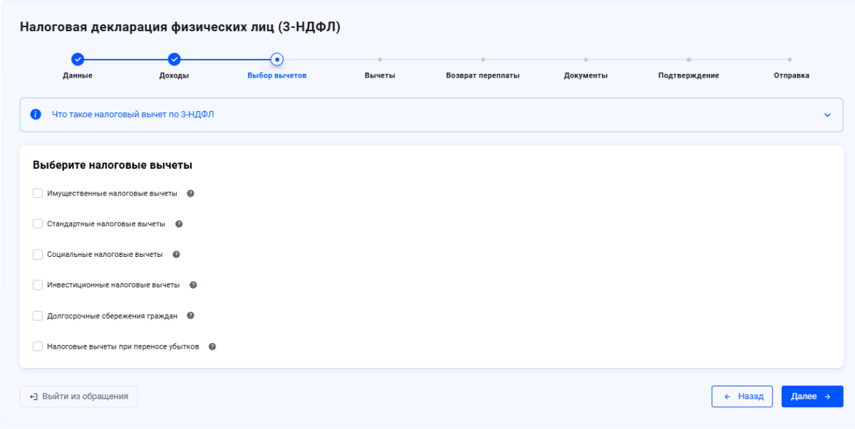После заполнения раздела с доходами нужно перейти в раздел выбора того налогового вычета, на который вы имеете право.