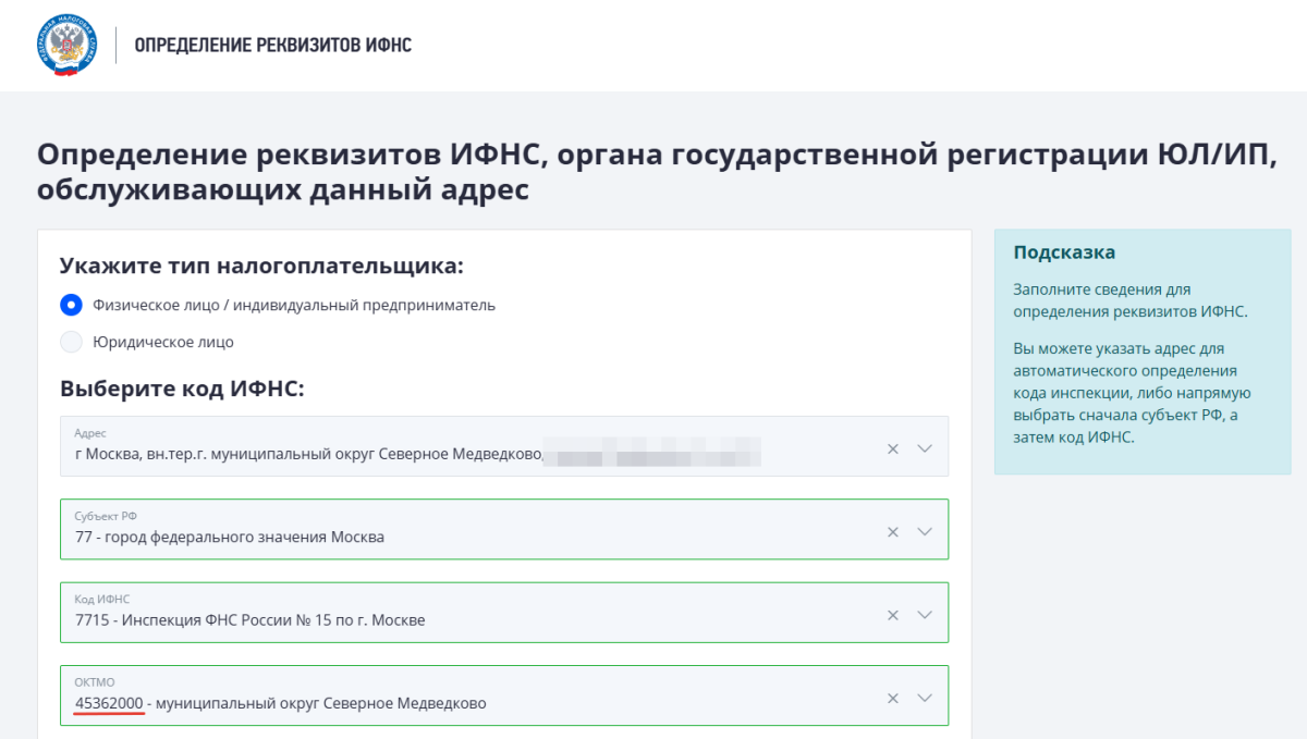 А вот «Код по ОКТМО» нужно будет взять по адресу вашей регистрации с помощью сервиса ФНС «Определение реквизитов ИФНС», вбив туда свой адрес регистрации.