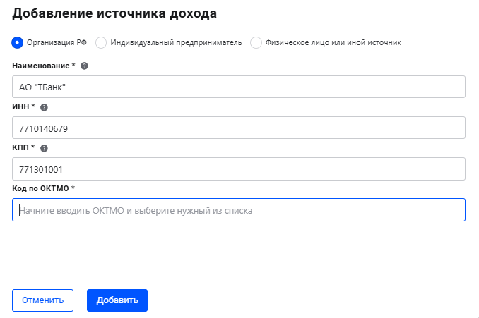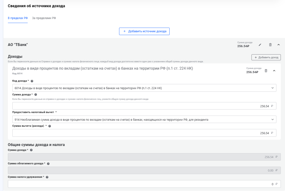 В доходах, полученных «в пределах Российской Федерации», нужно указать новые источники дохода — проценты по вкладам. При детальном указании доходов по каждому банку вероятность претензии со стороны налоговой инспекции будет крайне низкой. Здесь его можно добавить с помощью кнопки «+Добавить источник дохода».