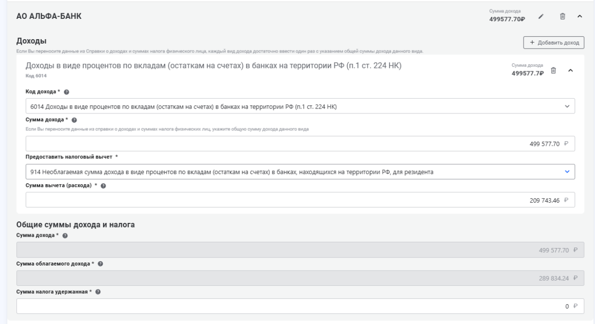 Заполнив каждую сумму дохода из налогового уведомления по процентам по вкладам, обязательно нужно указать код налогового вычета «914 — Необлагаемая сумма дохода в виде процентов по вкладам (остаткам по счетам) в банках на территории РФ, для резидента», сумма этого вычета будет уменьшать общую сумму дохода. За 2024 год вычет составит ₽210 тыс., а за предыдущий 2023 год вычет составляет ₽150 тыс.