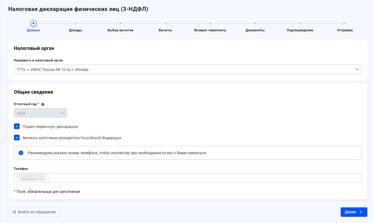 Проверьте инспекцию по месту учета и отметьте, впервые подается декларация или она уточненная. Укажите свой статус: помните, что вычеты полагаются только налоговым резидентам. Также желательно указать свой номер телефона. Нажимаем «Далее».